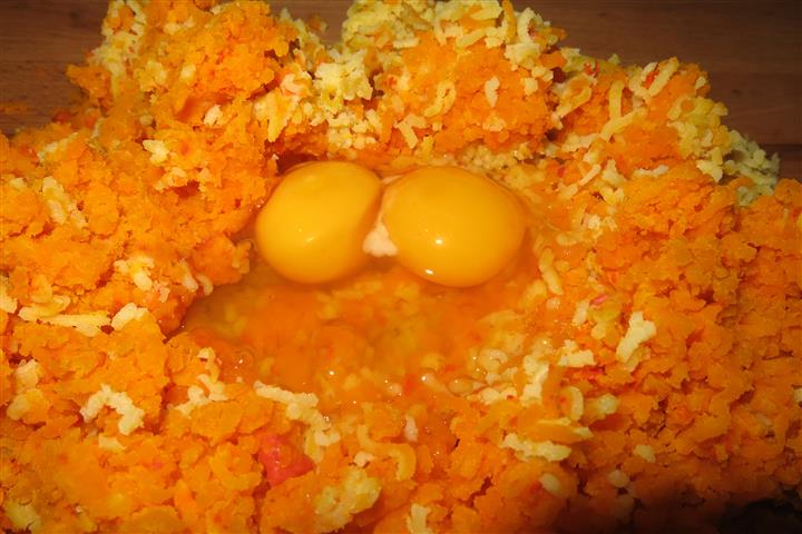 - Eine Mulde in die Mischung drücken, die Eier hineinschlagen, Mehl und nicht zu wenig Salz darübergeben. Alles (am besten mit einer Teigkarte) zu einem weichen Teig vermischen. Den Teig probieren und ggf. nachsalzen.